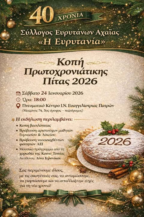 24/1 Σάββατο 6μμ Η Χορωδία της Κοινο_Τοπίας θα επενδύσει μουσικά την εκδήλωση κοπής πίτας του Συλλόγου Ευρυτάνων Αχαΐας <<Η Ευρυτανία>> στο Πνευματικό Κέντρο Ι.Ν. Ευαγγελιστρίας Πατρών (Μαιζώνος 74, 5ος όροφος) ελεύθερη συμμετοχή