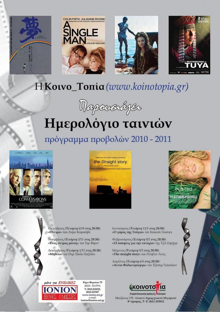 Να υπενθυμίσουμε ότι οι προβολές γίνονται στον πολυχώρο της Κοινο_Τοπίας, Μαιζώνος 139 και Παντανάσσης 4ος όροφος (έναντι Δημαρχιακού Μεγάρου) στην Πάτρα, με ελεύθερη είσοδο. Υπεύθυνος για τη δράση είναι ο Παναγιώτης Καρώνης,karonispan@gmail.com
