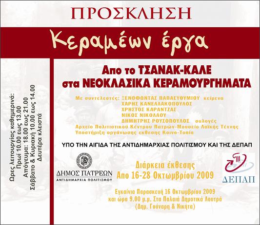 Έγιναν χθες Παρασκευή 16 Οκτωβρίου 2009 τα εγκαίνια της έκθεσης ‘‘ΚΕΡΑΜΕΩΝ ΕΡΓΑ’’ στα Παλαιά Δημοτικά Λουτρά της Πάτρας παρουσία πλήθους κόσμου. Η έκθεση που γίνεται με την επιμέλεια του Χάρη Κανελλακόπουλου Διακοσμητή, και Ξενοφώντα Παπαευθυμίου Μουσειολόγου, με θέμα: ‘‘ΚΕΡΑΜΕΩΝ ΕΡΓΑ’’ από το Τσανάκ-Καλέ στα νεοκλασικά κεραμουργήματα παρουσιάζει για πρώτη φορά στο κοινό της Πάτρας δεκάδες αξιόλογα δείγματα μιας άλλης εποχής τα οποία βρίσκονται σε ιδιωτικές συλλογές στην Πάτρα και στον Πύργο και προσφέρθηκαν για να εκτεθούν.